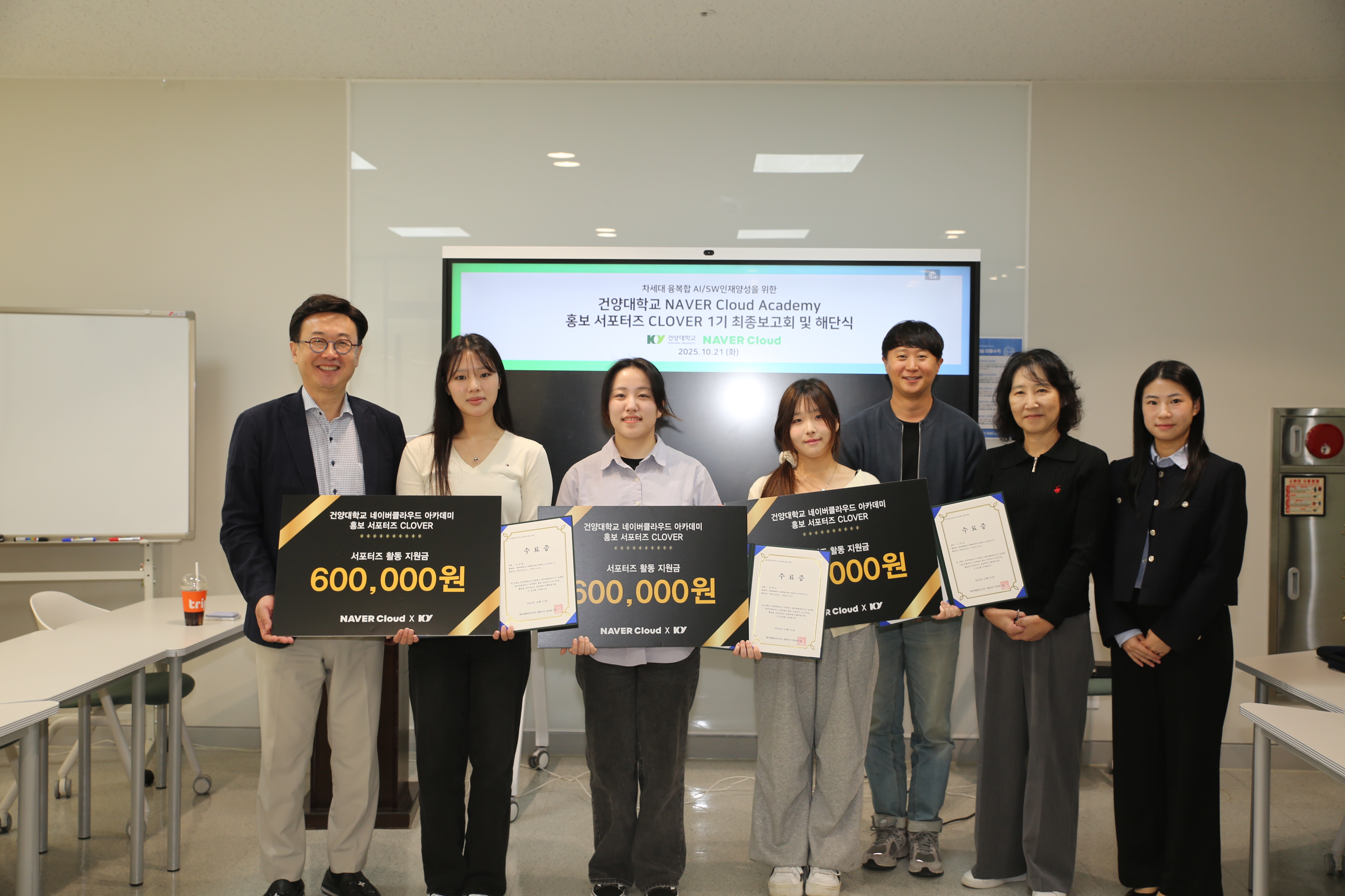 『 건양대학교 네이버클라우드 아카데미 홍보 서포터즈 CLOVER 1기 활동 』글의 상세내용을 확인하는 표로 제목, 부서명, 등록일, 조회, 첨부, 내용으로 나뉘어 설명합니다.